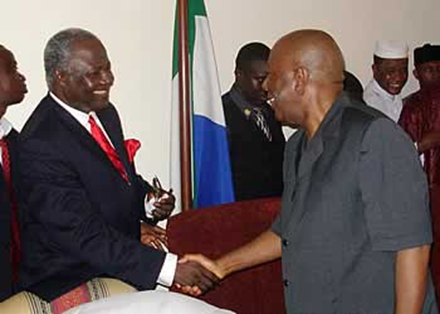 Newly elected Sierra Leonean President Ernest Bai Koroma (left) shakes hands with outgoing leader Ahmad Tejan Kabbah on Sept. 17 in Freetown.